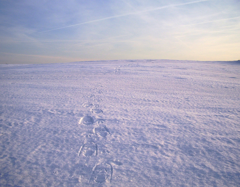 Ich bin absolut allein, egal in welche Richtung ich schaue. Niemand ist vor mir, niemand hinter mir, denn die Felder sind ohne Schneeschuhe unpassierbar. Ich treffe nur Rehe, Hasen und Schneemänner.